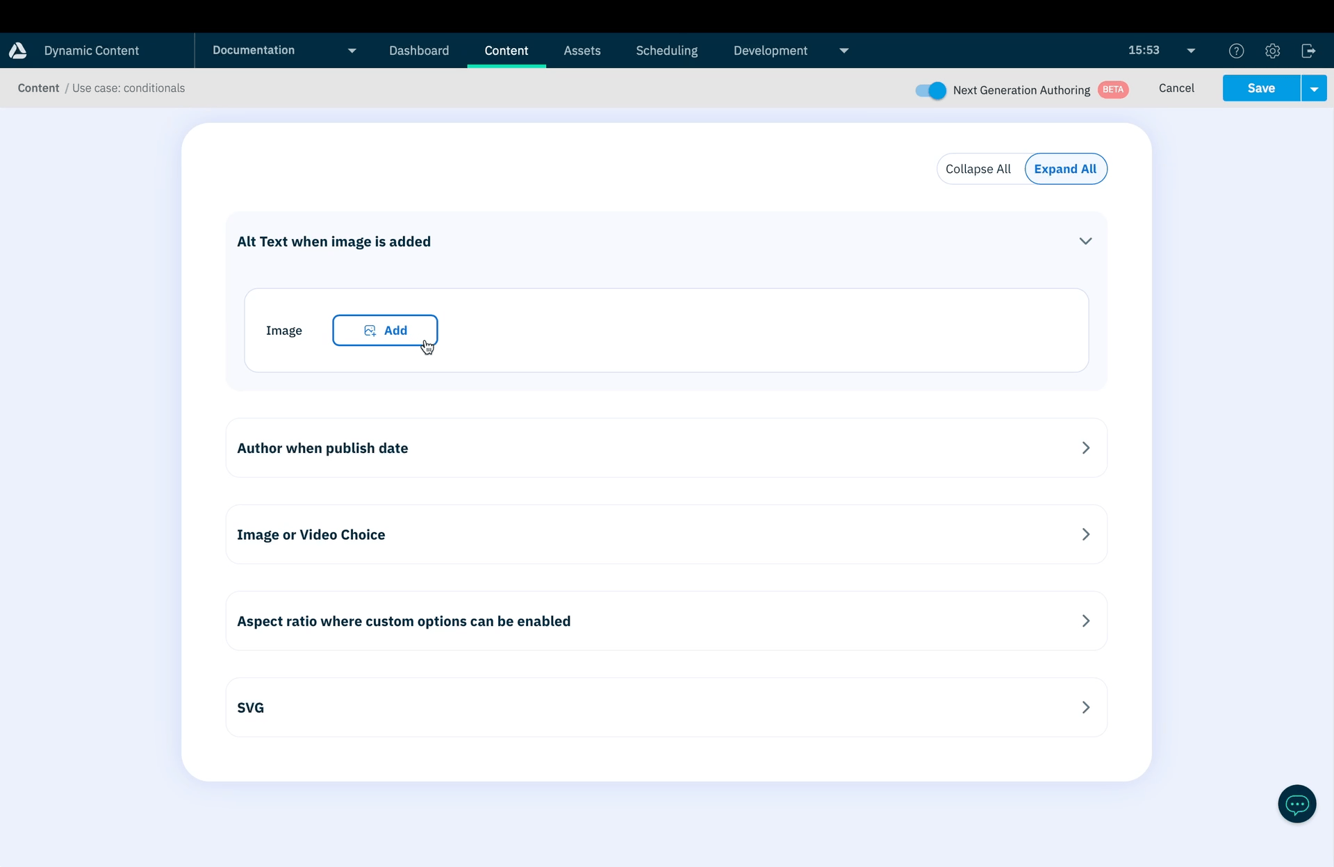 In some circumstances, a schema containing a conditional was being displayed as a blank screen in the content form. This issue has now been fixed and we've updated our conditionals schema example. Our updated conditionals example shows how to show some alt text only when an image has been added.