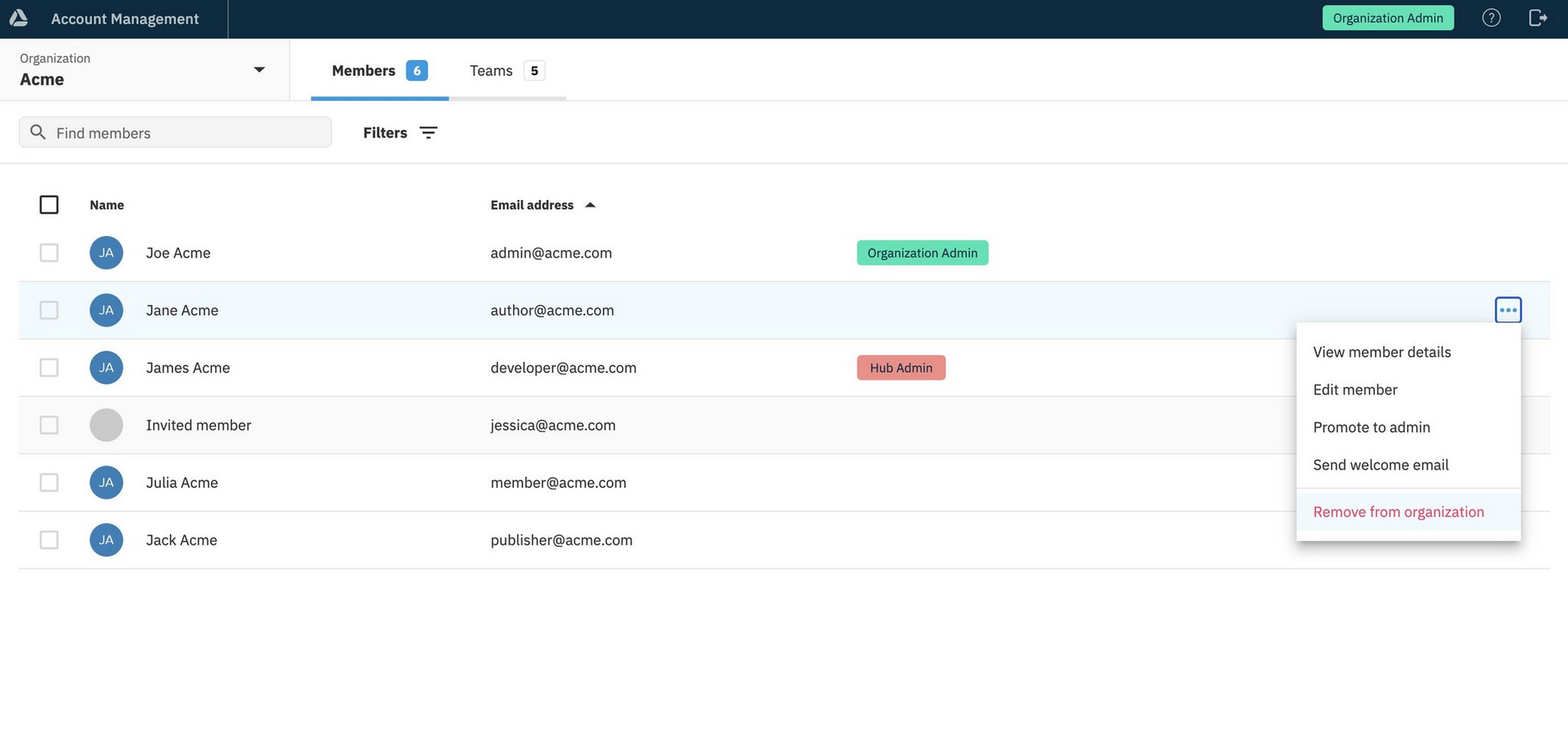 Account Management shows the members and teams for your selected organization. If you have more than one organization, you can switch to a different one. If you log in as an organization or hub admin user, your permission level is displayed at the top of the window. In the example below, an organization admin user is logged in.